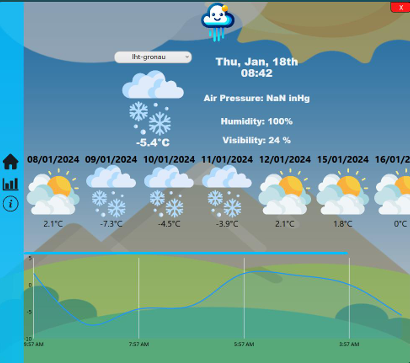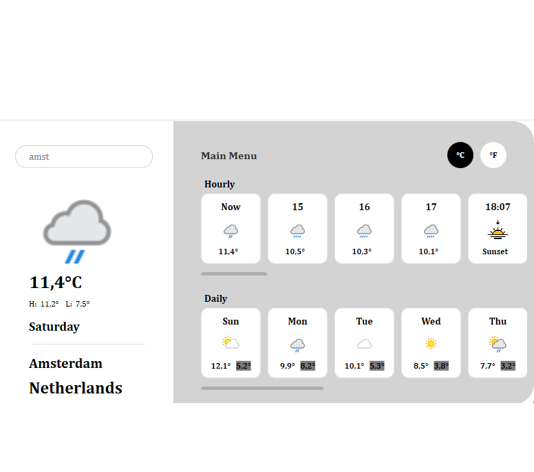 This C# .NET application uses the MVVM pattern to provide real-time weather updates by fetching data from a weather API. Users can search for any location to view current conditions, hourly forecasts, and daily temperature trends. The temperature can be converted between °C and °F.