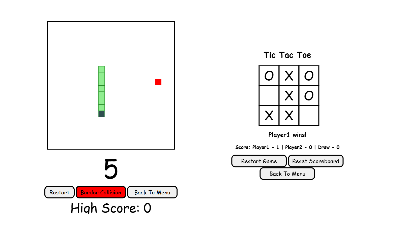 This web-based project features a game menu where users can choose between Snake and Tic-Tac-Toe. The Snake game challenges players to grow their snake while avoiding collisions. Tic-Tac-Toe offers both a 2-player mode and a 1-player mode with an AI opponent. Built with a focus on interactivity and user experience, this project delivers fun and engaging gameplay.
