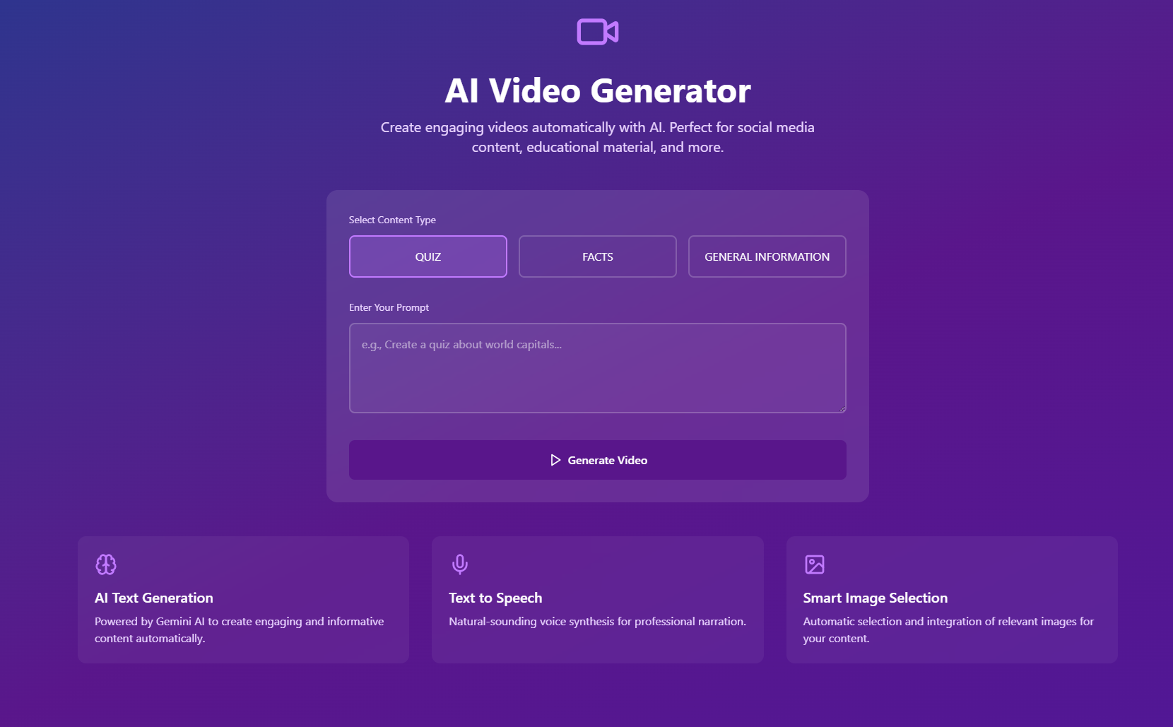 This AI-driven video generation platform, built using React for the frontend and Python (Flask) for the backend, transforms text prompts into engaging videos. It integrates Gemini for text generation, ElevenLabs for text-to-speech, and Google API for sourcing images and videos, while MoviePy handles video editing and composition.